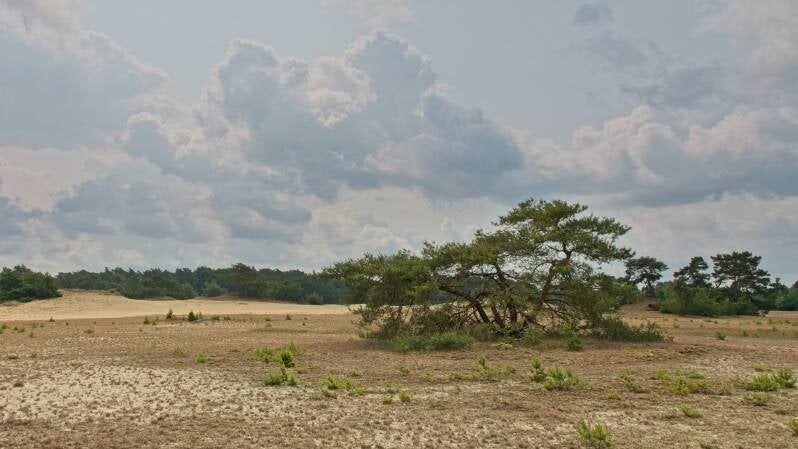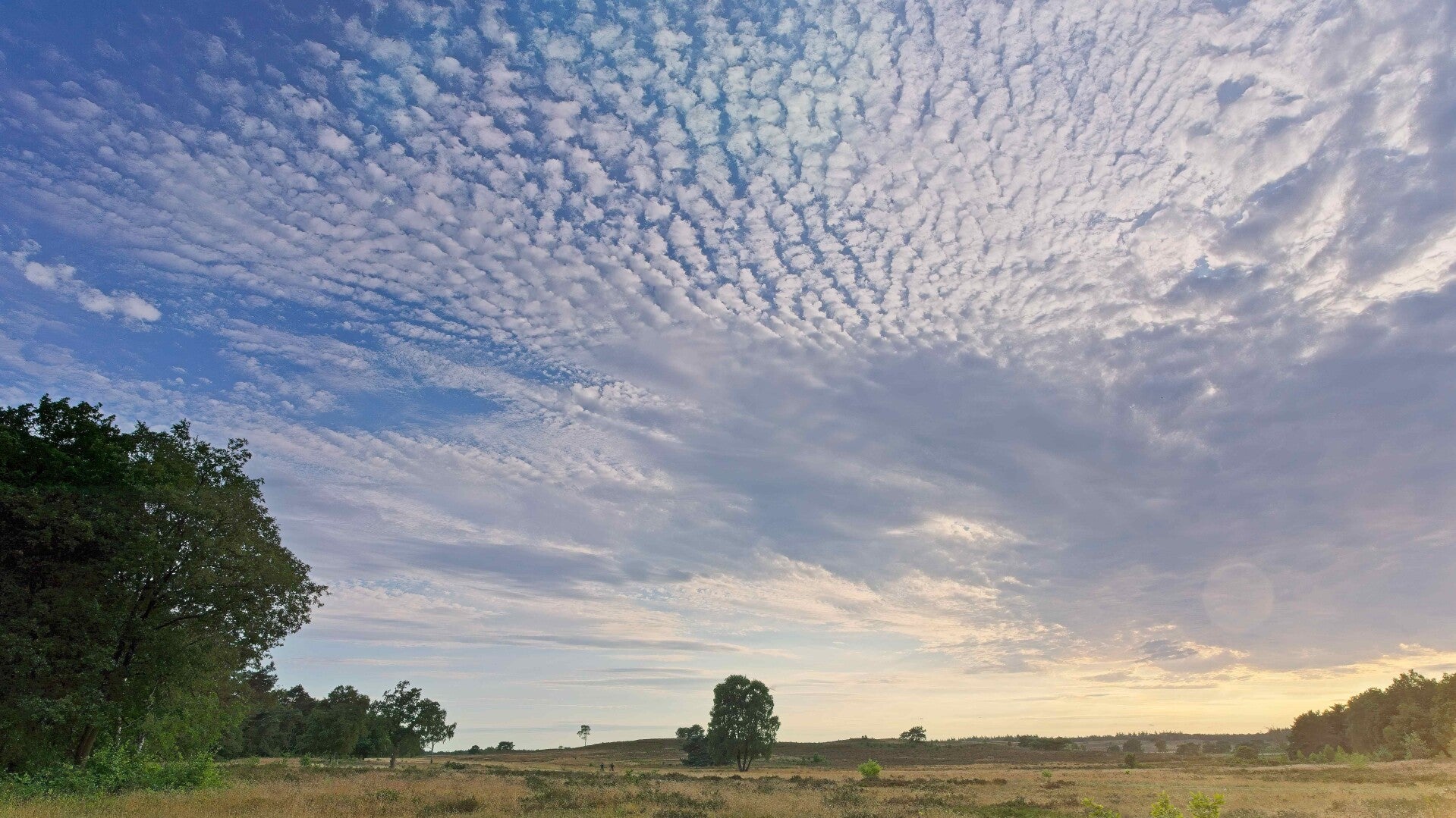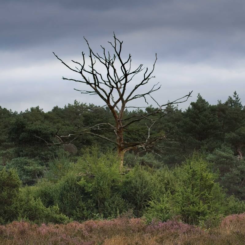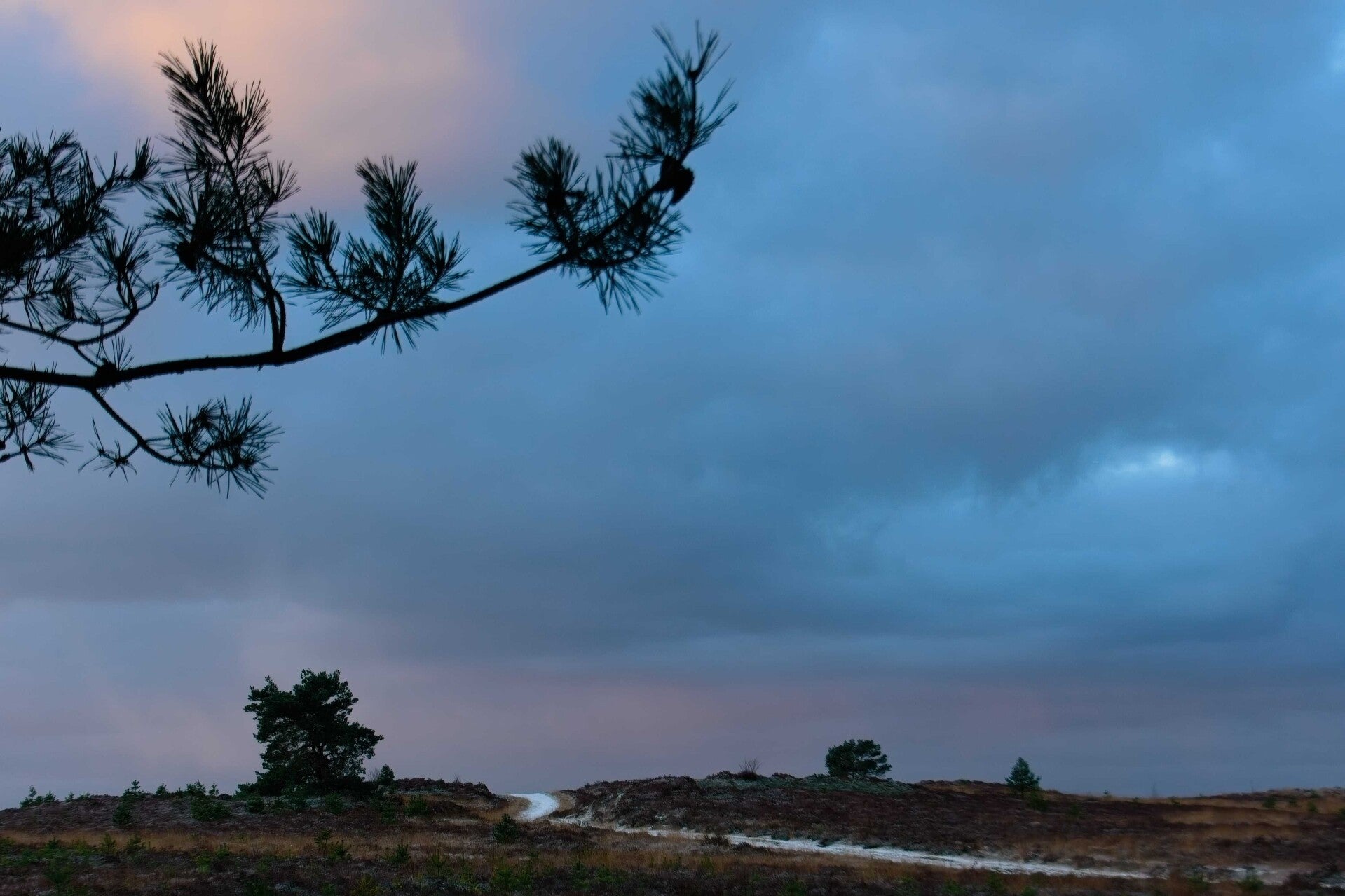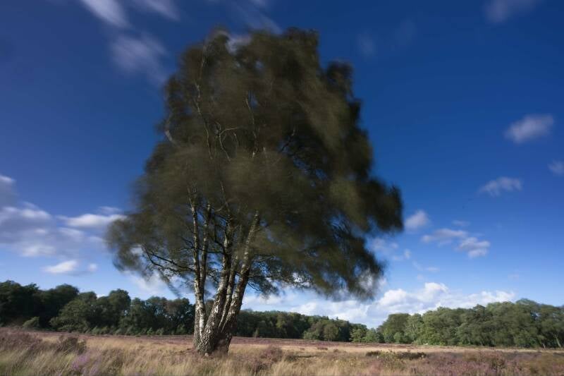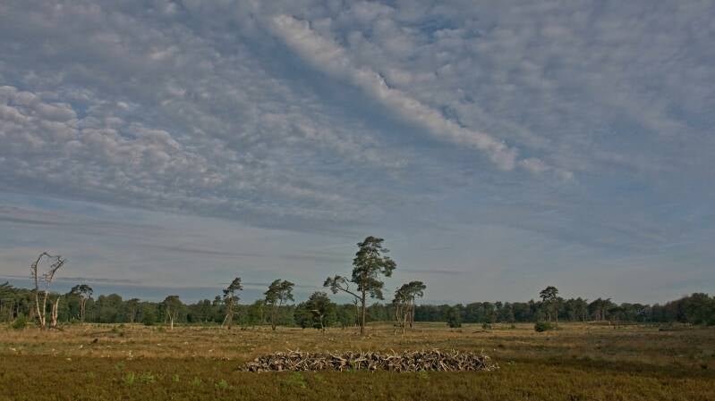 Aan de lucht zie je al dat het weer deze week omslaat. Aan de kust zorgt een storm voor overlast. Hier op de Veluwe zijn het zware windstoten die bomen op de hei laat buigen. De buien en het relatief warme weer leveren wel mooie plaatjes op.
