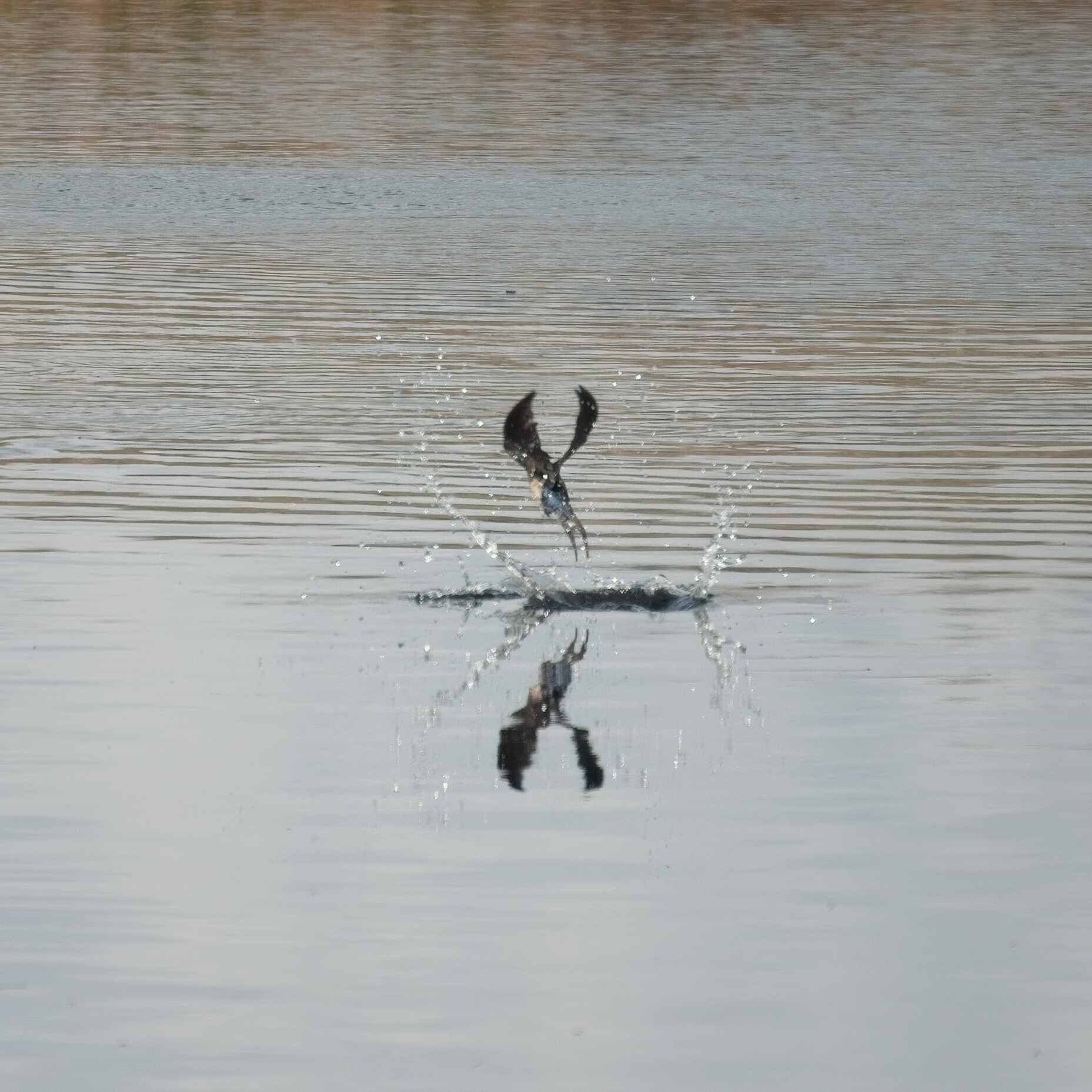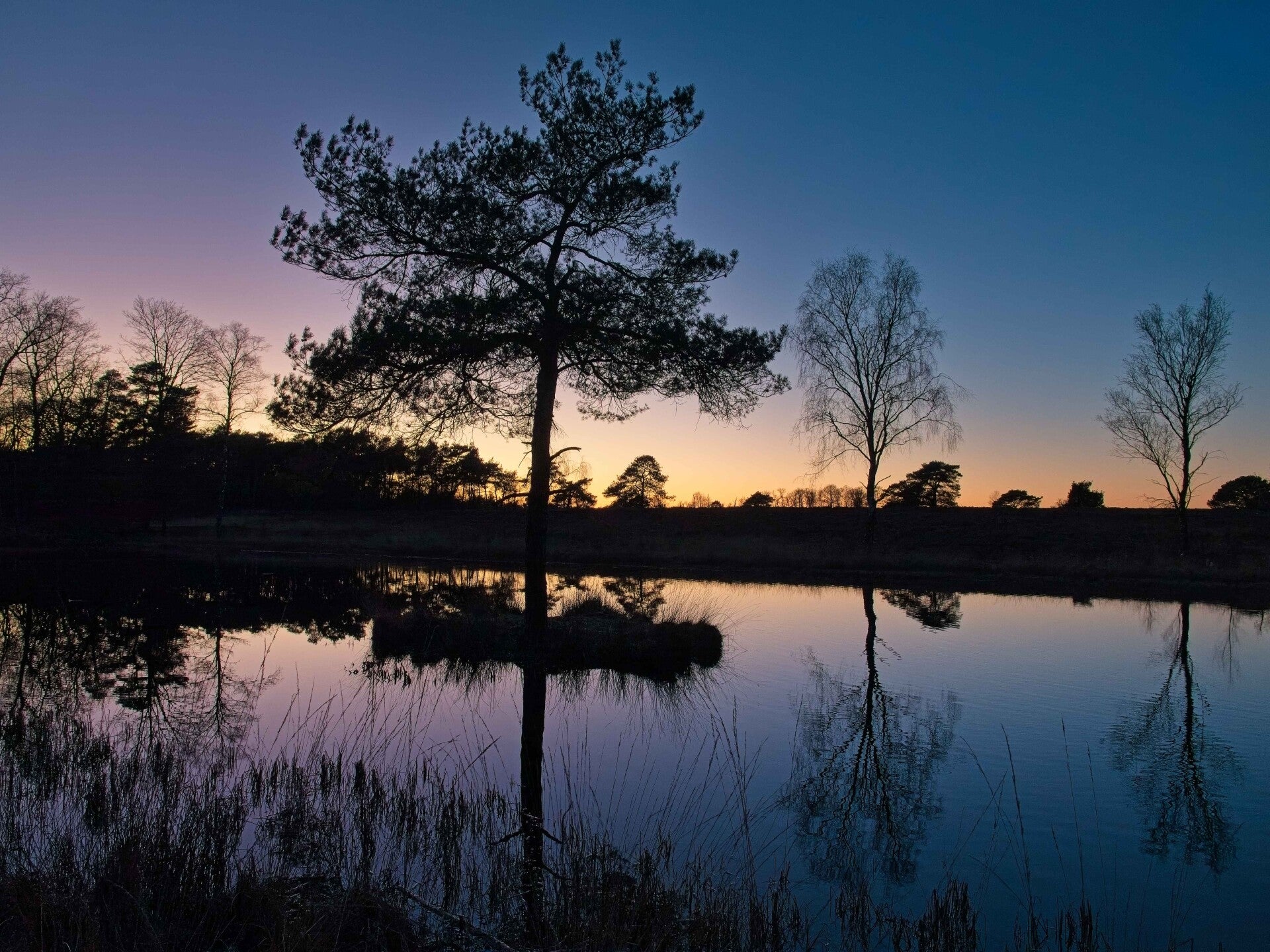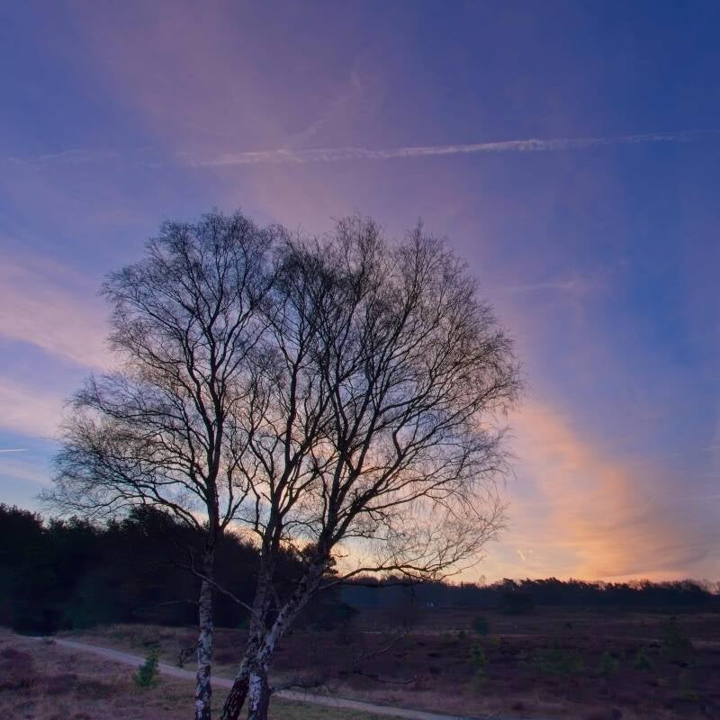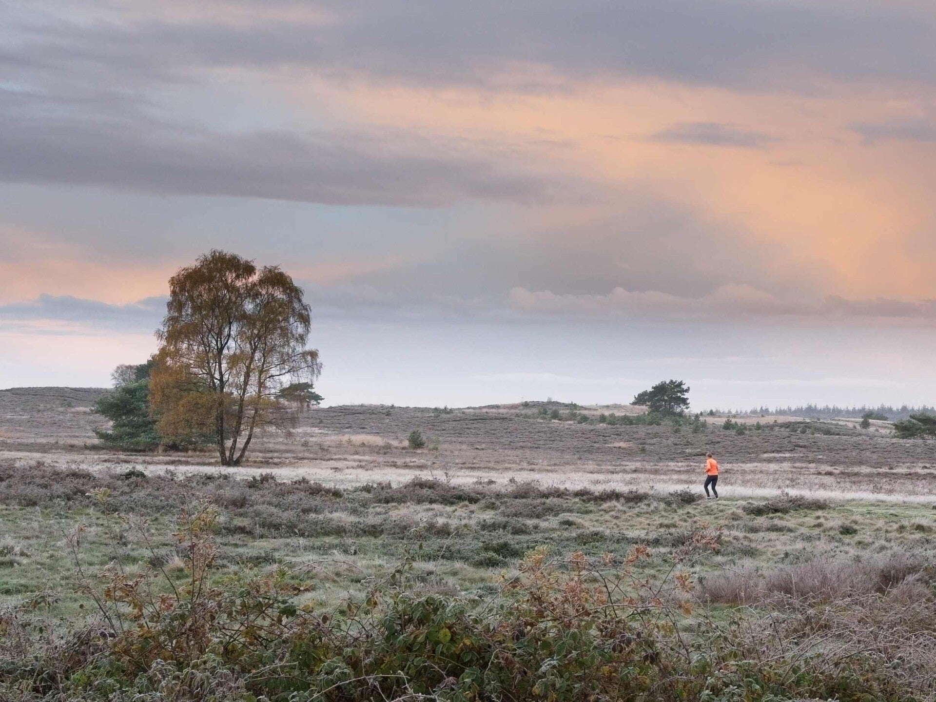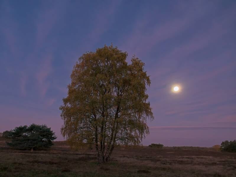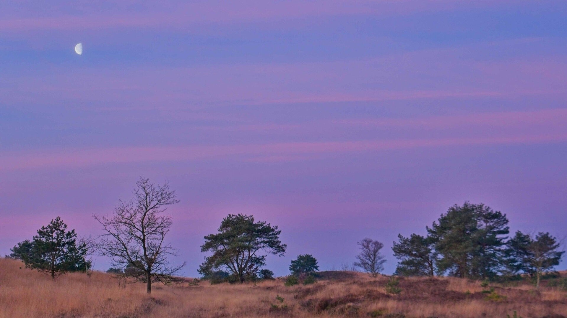 Bij een koude zonsopkomst kan de lucht soms heel even paars kleuren! Na een paar minuten komt de zon op en gaat blauw/geel overheersen en daarmee verdwijnen de warme kleuren. Leuk dat de maan nog boven de horizon te zien is. Er trekken massaal kraanvogels over Nederland (door de oostenwind). Ik spot er een paar boven de Elspeterheide.