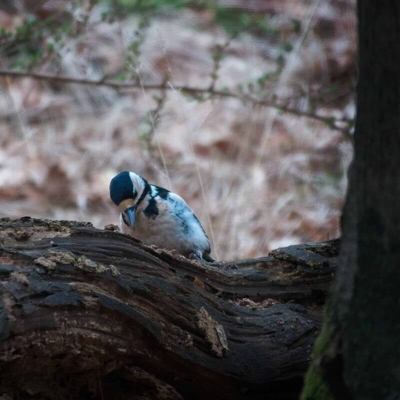 De week van de verborgen vogeltjes... Een middelste bonte specht is druk bezig insecten onder het schors van een omgevallen boom te kloppen.