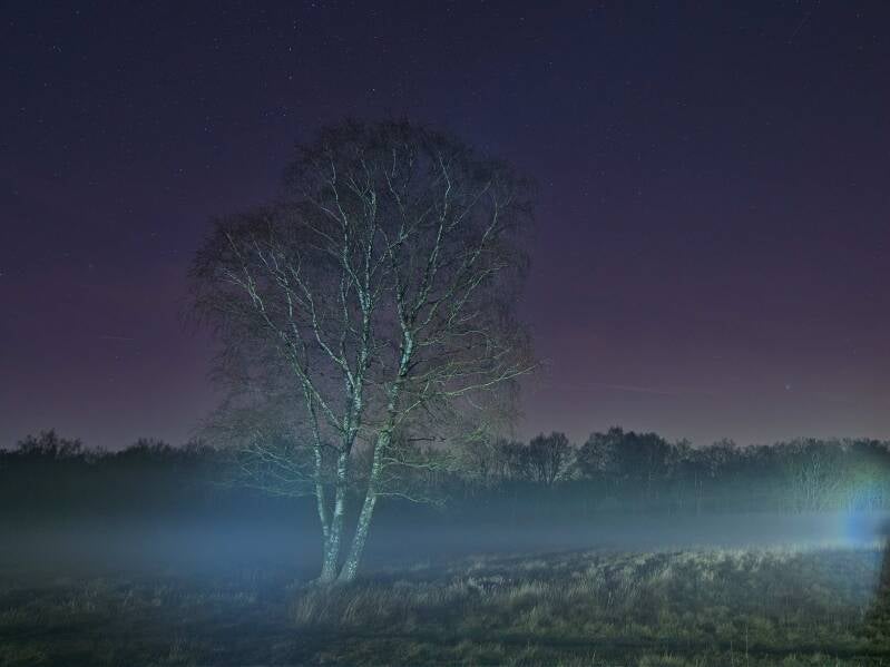 De noorderlicht app geeft dit jaar al een paar keer een melding. Met de kleurgevoelige camera is de hemel wat groen. Sterrenbeeld Grote Beer (steelpannetje) is wel goed te zien aan de linkerkant. De volgende ochtend zweven de 'witte wieven' boven de hei, die snel verdampen wanneer de zon doorbreekt.