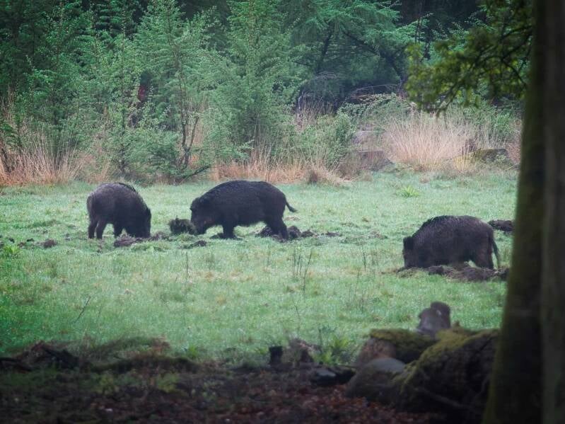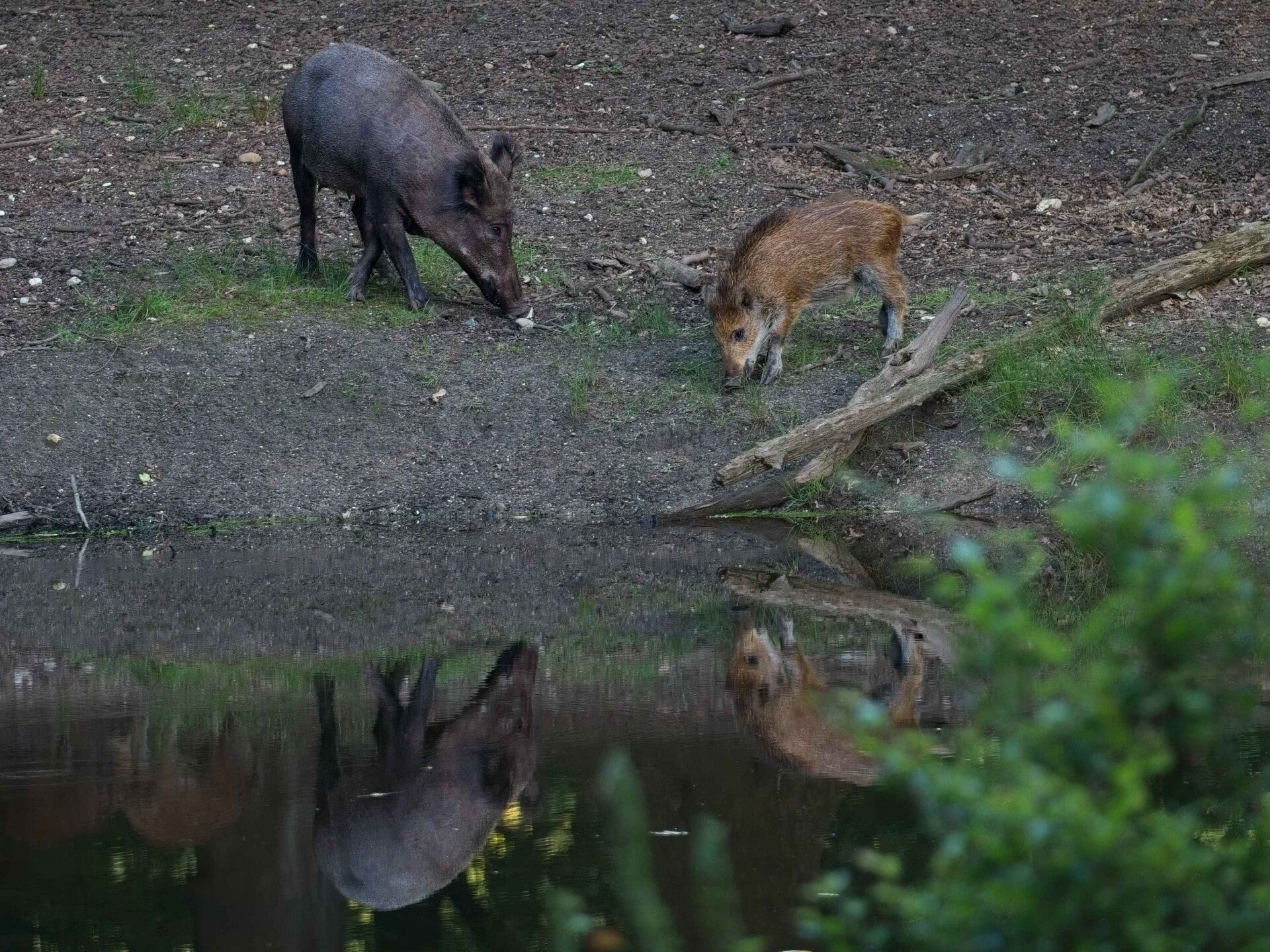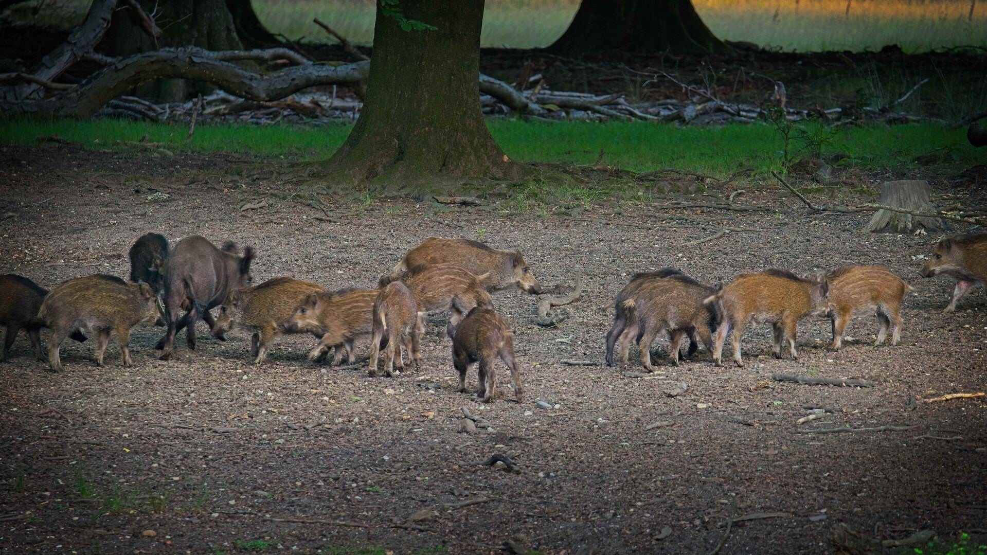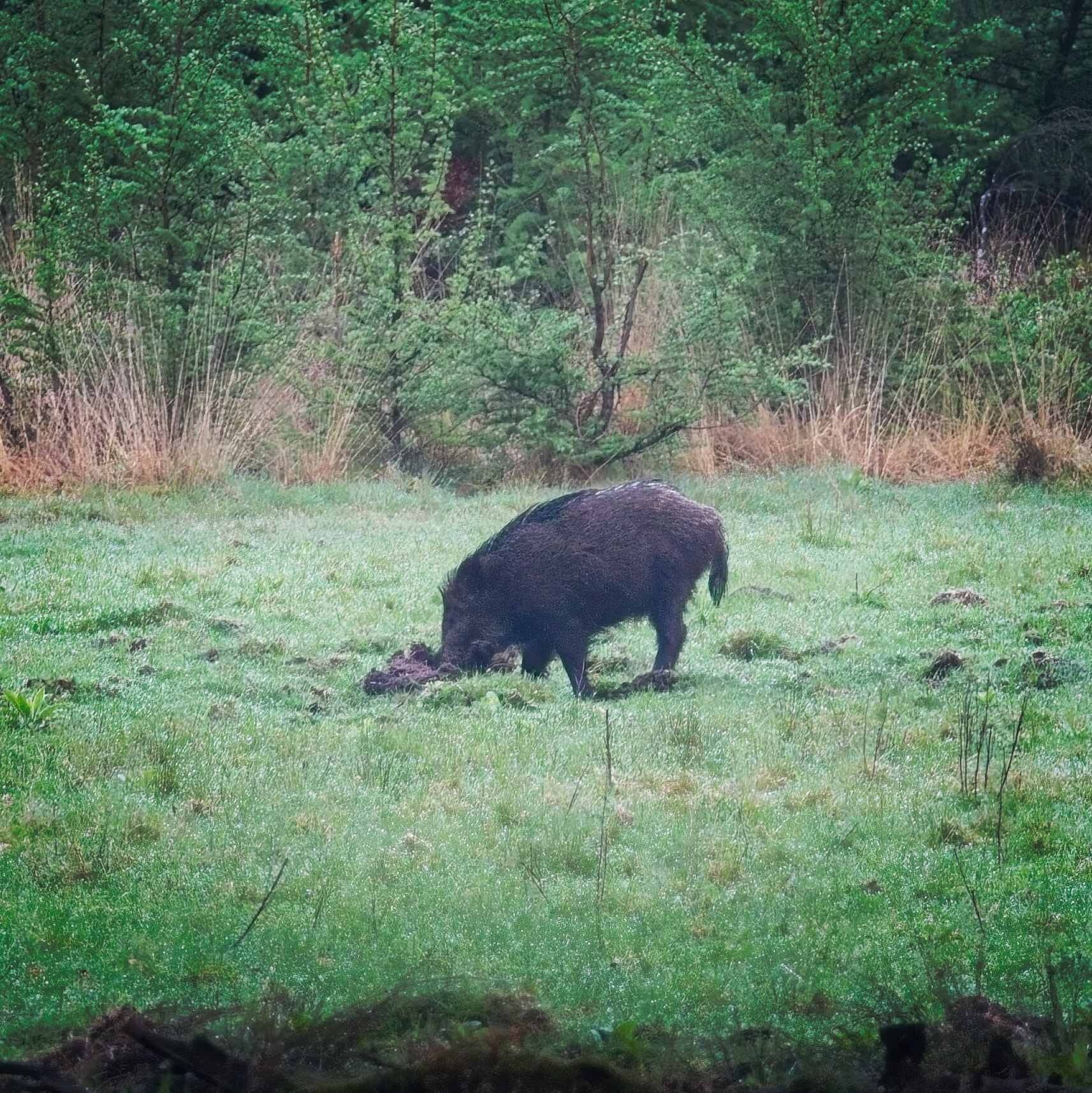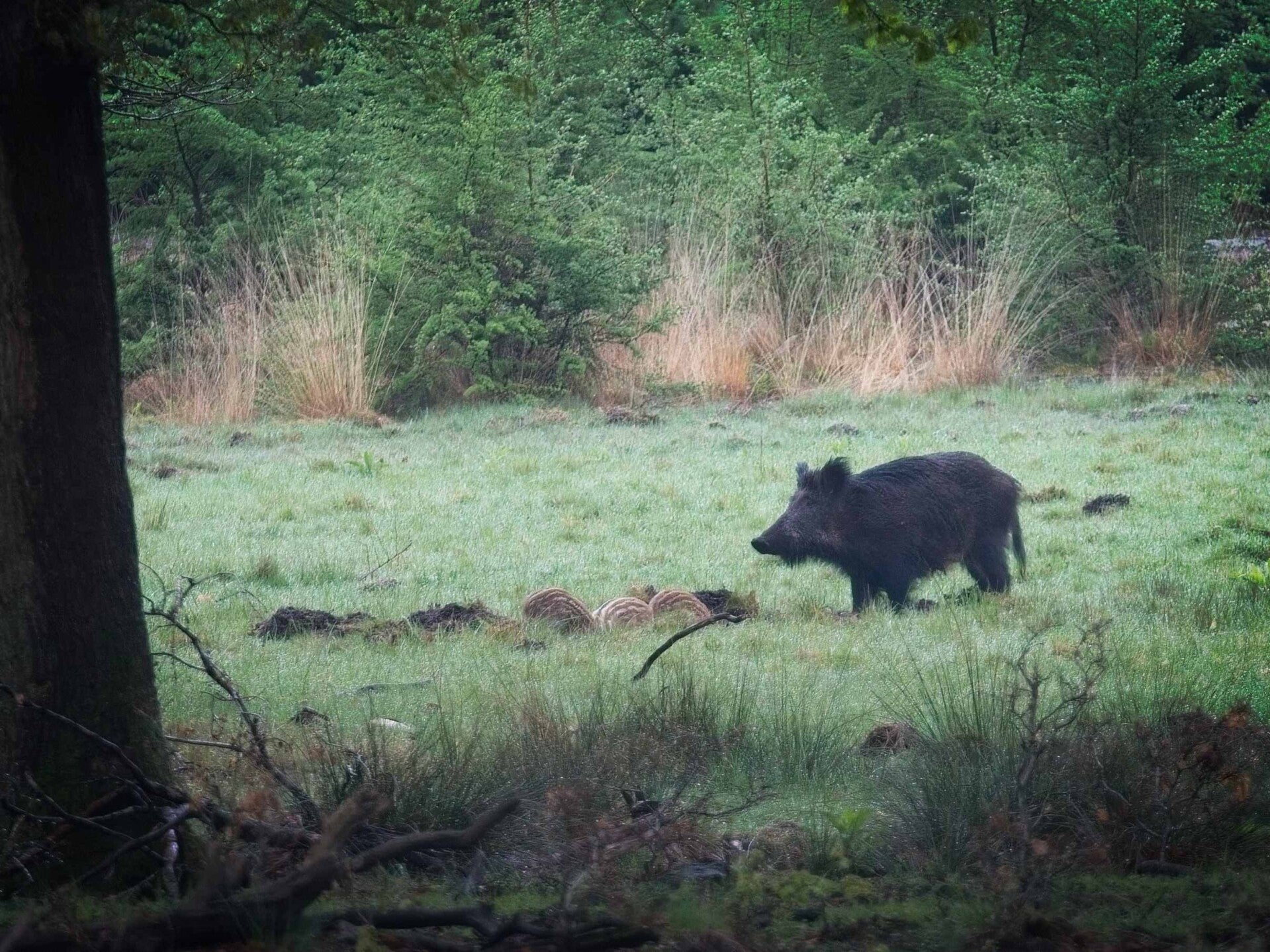 Na een (warme) regendag is het in de avond weer droog en dan is het ideaal weer voor wilde zwijnen. De insectenlarven die ze graag eten zitten vlak aan de oppervlakte. Na een uurtje is er dan weer een flink stuk Veluwe omgespit. De jonge biggetjes liggen overigens lekker te pitten.