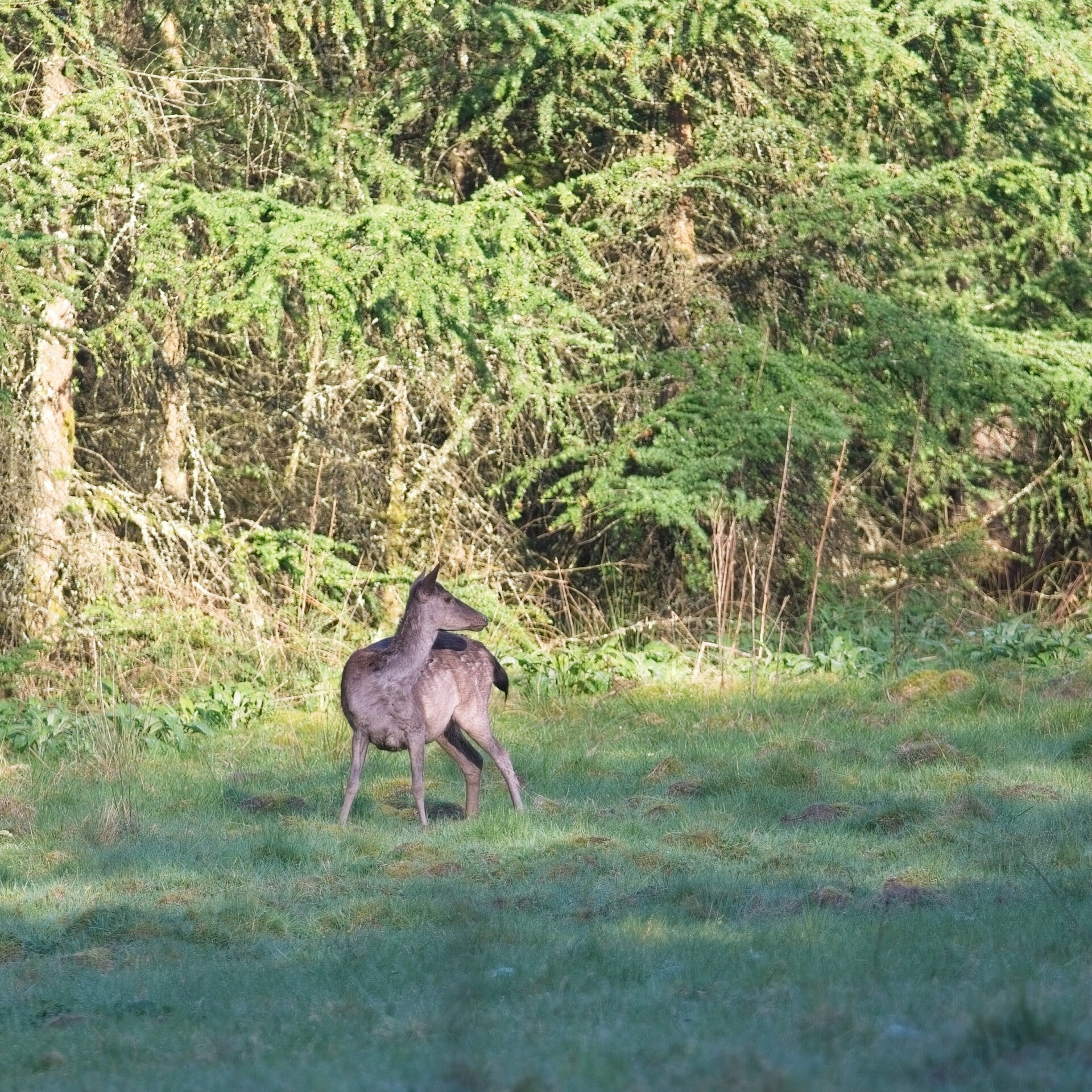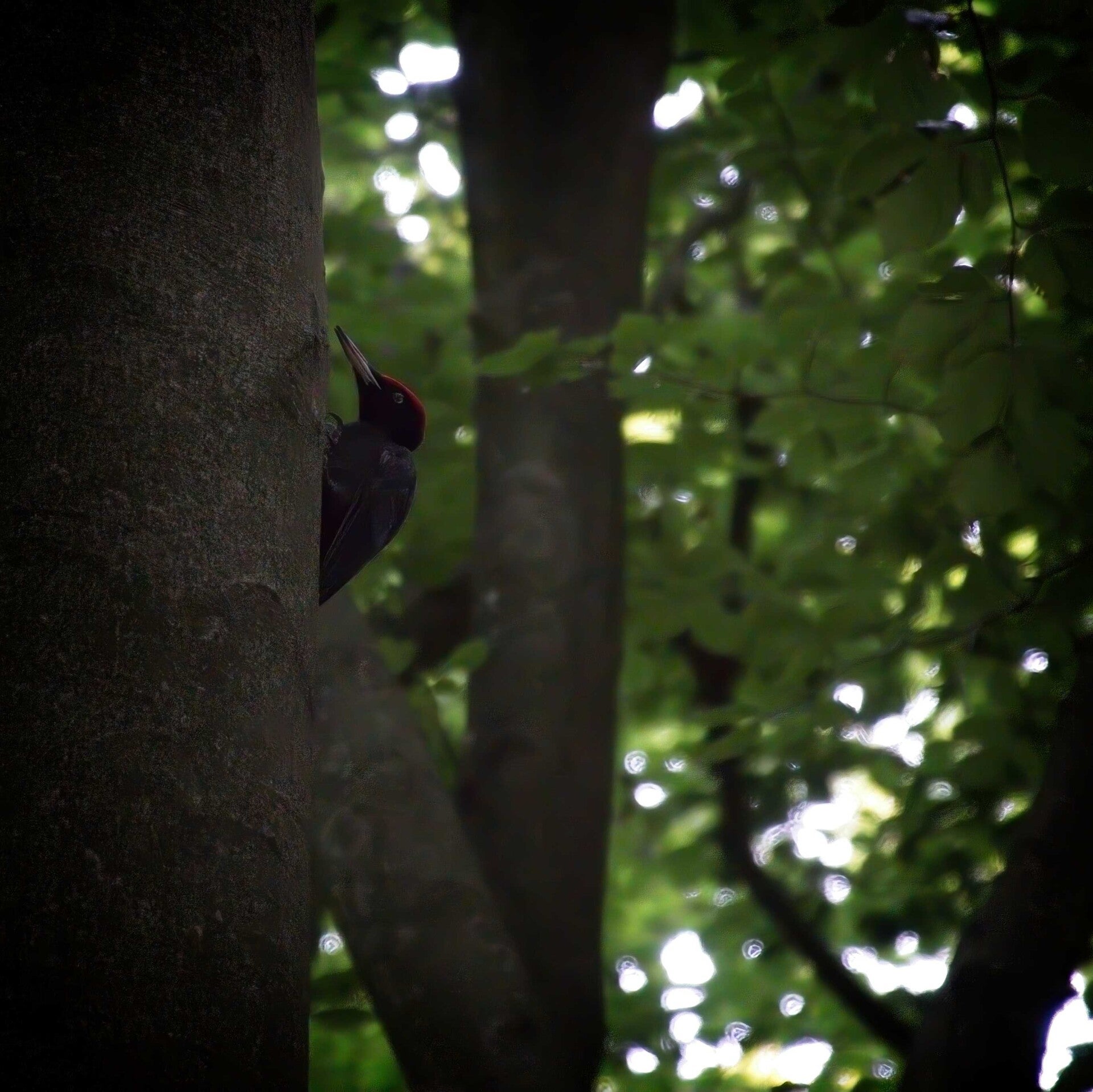 Een zwarte specht herken je goed aan zijn 'kru-kru-kru' roep, maar ze laten zich zelden zien. Op een avond vlogen er zowaar twee boven mijn hoofd door het oude beukenbos. Het zijn grote vogels en hun mooie rode petje valt op. In het Vierhouterbos hebben de meeste damherten een zwarte vacht (in plaats van de bekende roodbruine kleur met witte vlekjes).