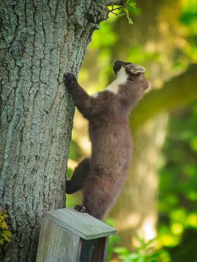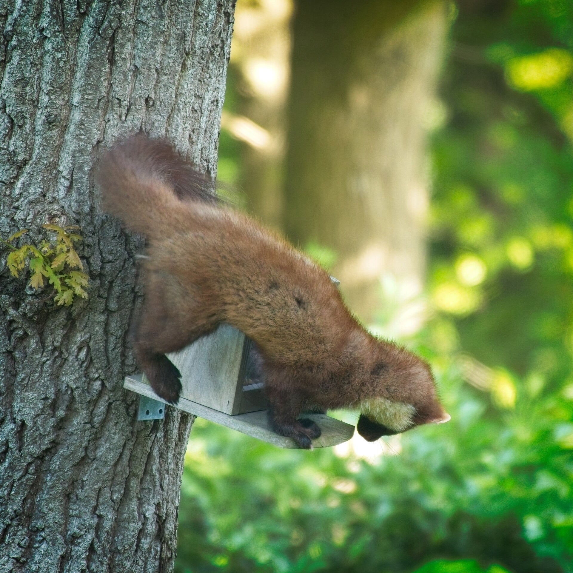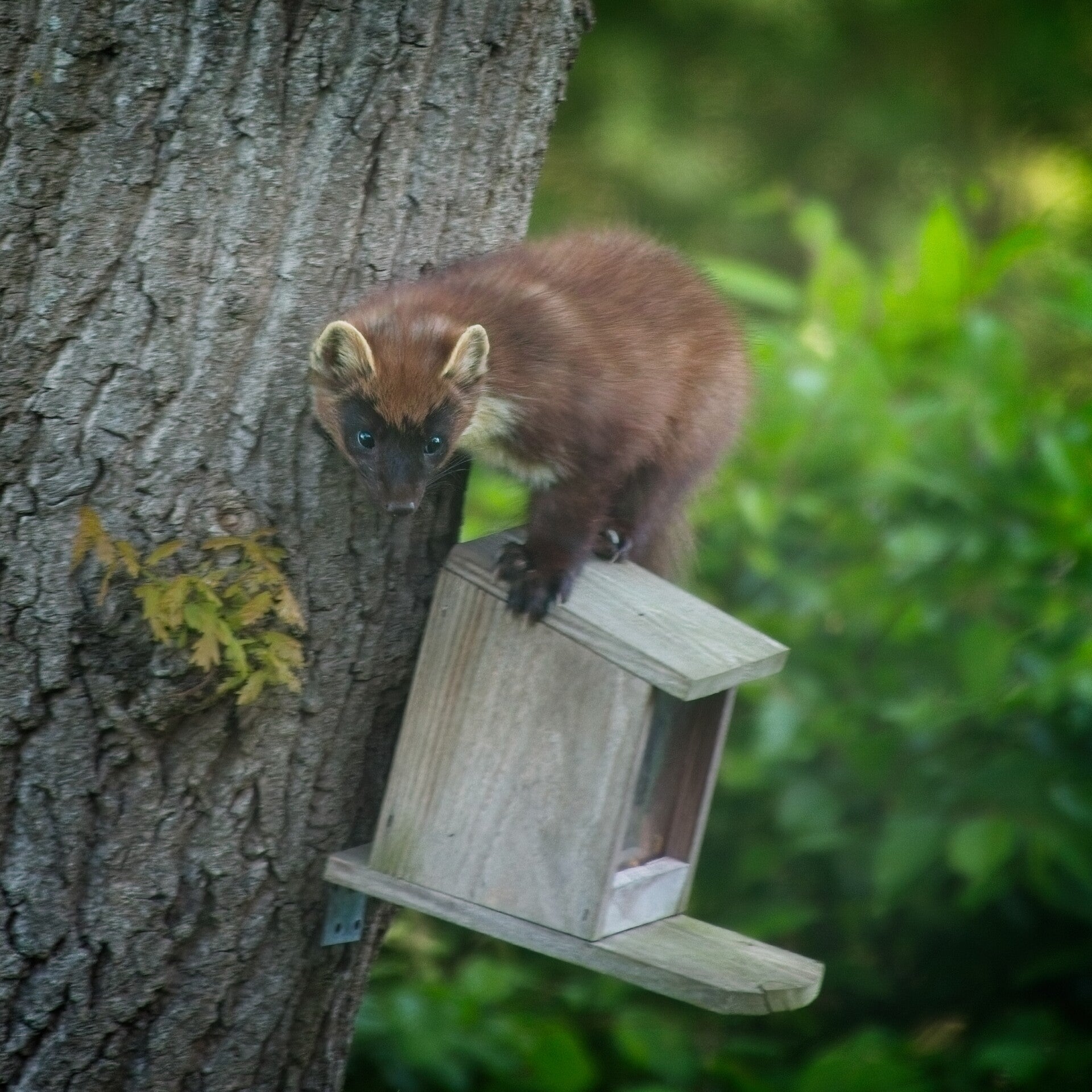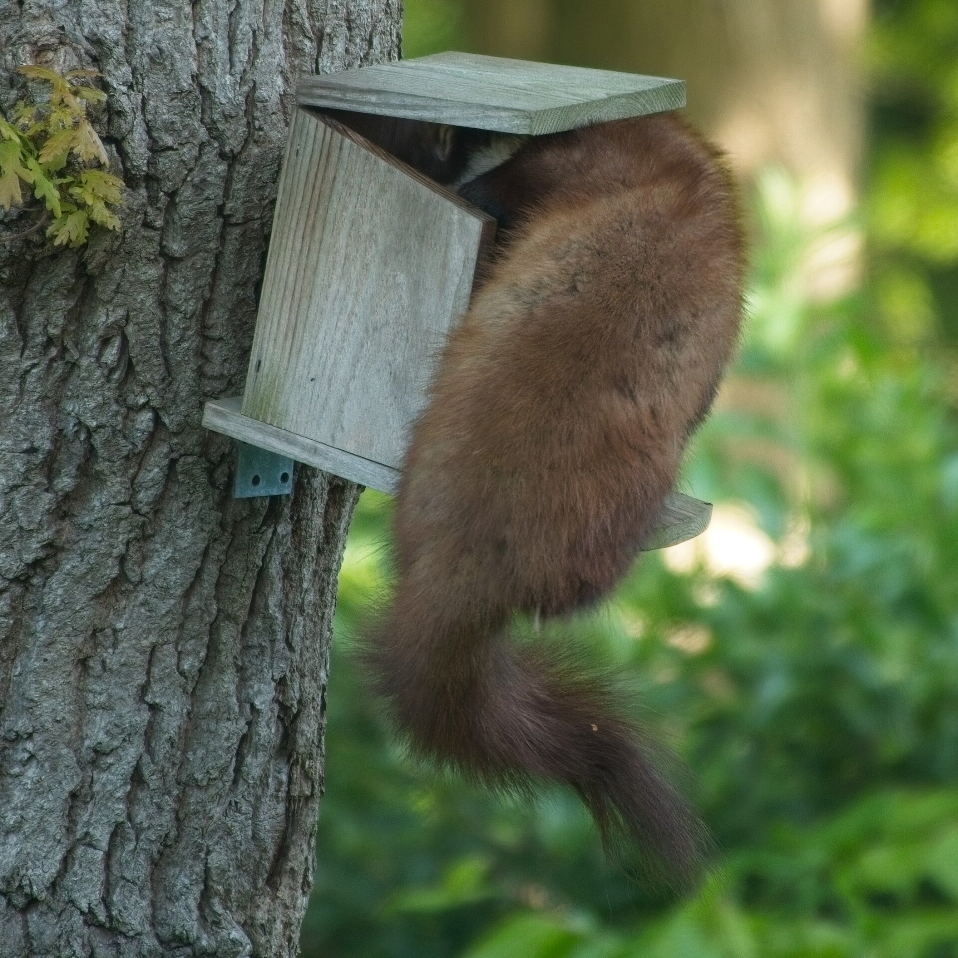 Deze week kwam ik niet toe aan mijn wekelijkse 'door weer & wind' zwerftocht. Terwijl ik druk aan het werk was in onze 'Tiny Office' zag ik uit mijn ooghoek dat een boommarter het voerhuisje voor de eekhoorns plunderde. Gewoon aan het eind van de ochtend in onze tuin. Hij was zo druk bezig dat ik mijn camera uit huis kon halen om een paar gave foto's te maken. Hij heeft een paar hazelnoten gejat en vervolgens via de top van de boom er vandoor gegaan. Onder aan de boom zat onze kat overigens vol verbazing te kijken naar dit tafereel.