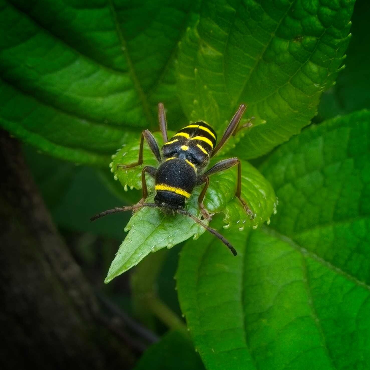 Nog een meester in vermomming is de kleine wespenboktor. Lijkt een wesp maar is een tor. Hij is vooral in mei/juni te zien in beukenbossen.