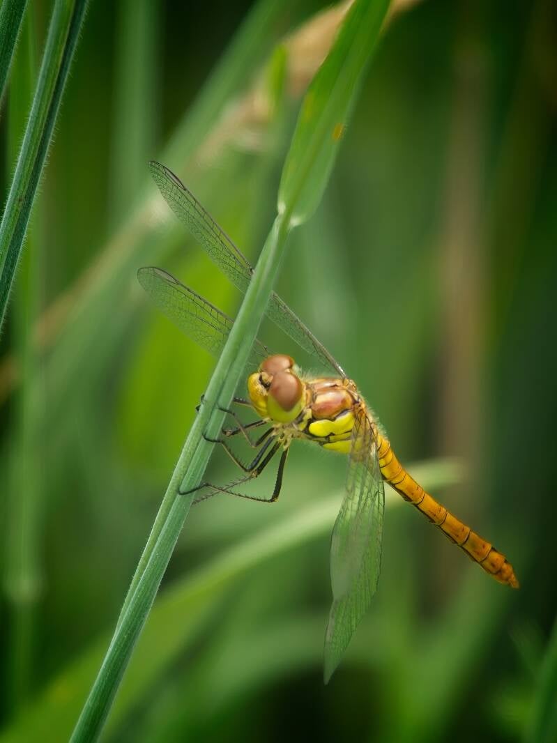 De warmste 1 en 2 juli ooit gemeten (33,2 grd in De Bilt). Op de heide is het zelfs nog een paar graden warmer en berken laten hun blaadjes hangen om waterverlies te voorkomen. Op natte plekken met riet zitten veel insecten en die houden wel van warm weer. Ik spot een kolibrievlinder die met een uitrolbare tong nectar opzuigt. Een rietkruisspin vangt waterjuffers.