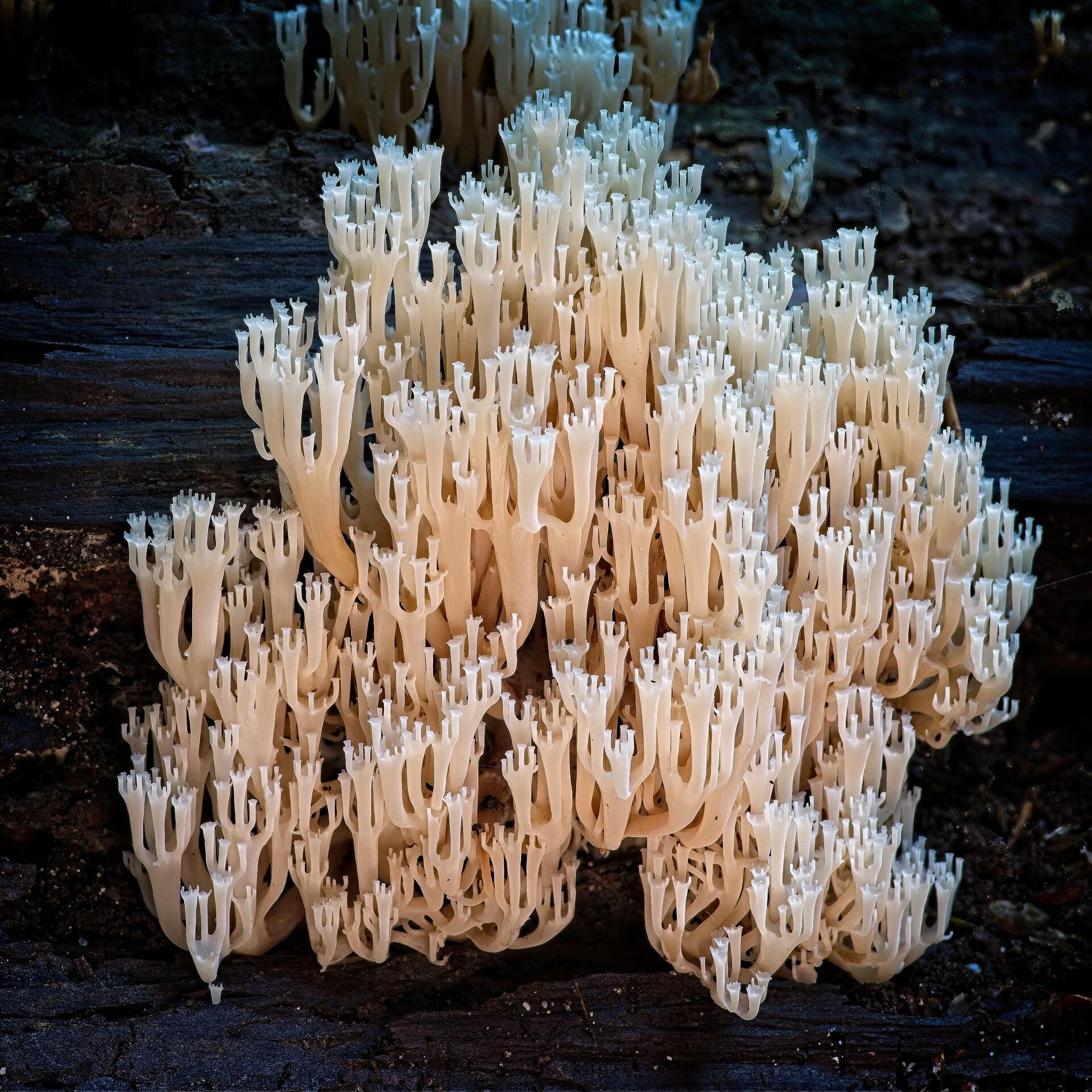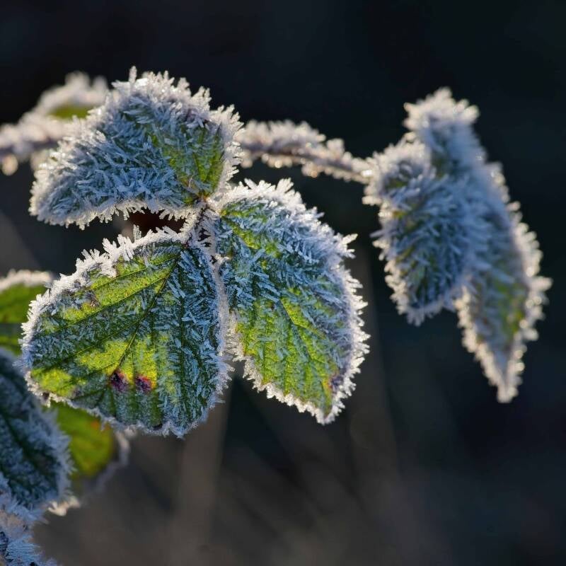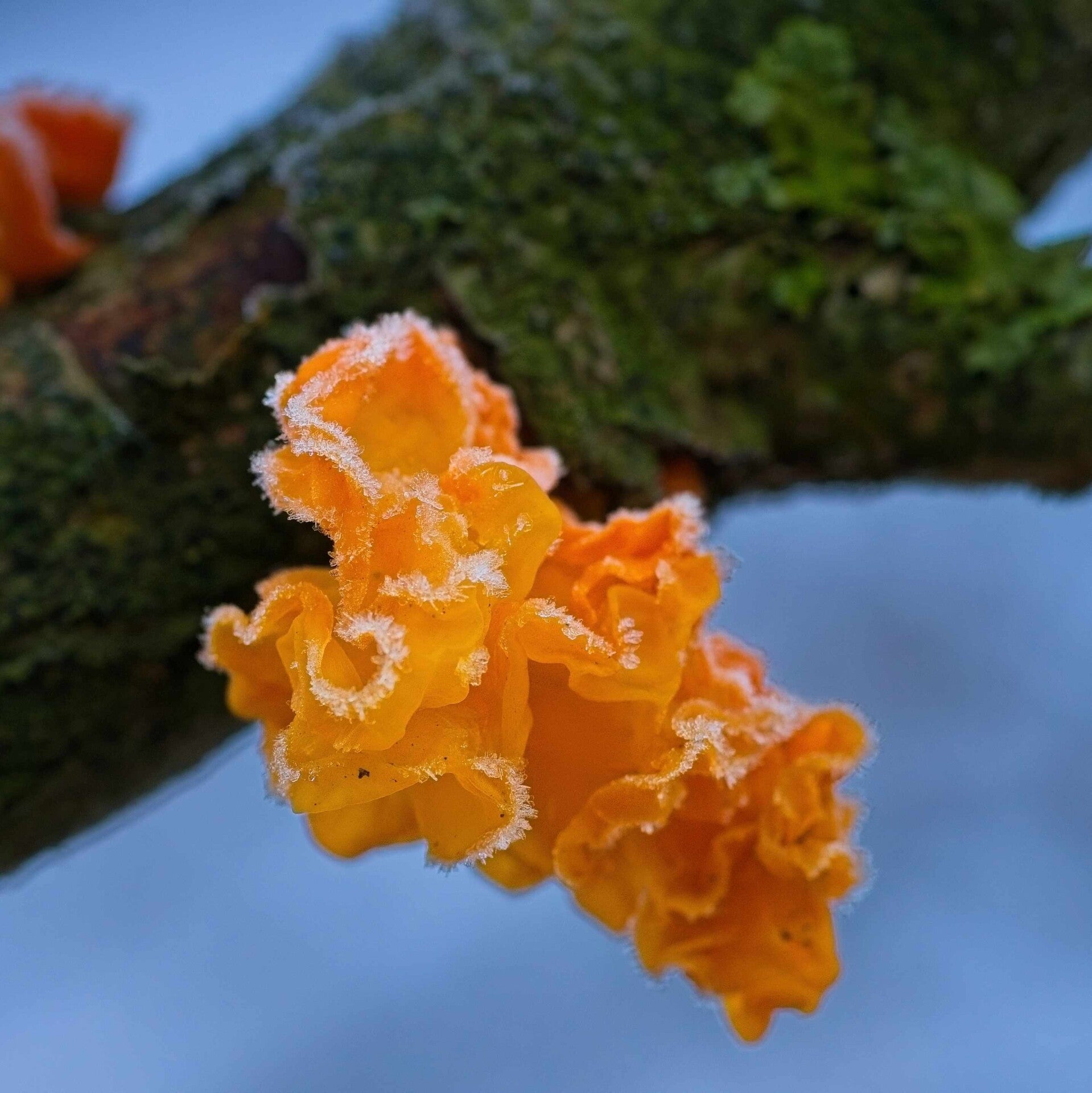 De ochtenden starten met prachtige ijskristallen op takjes, blaadjes en zelfs op deze feloranje schimmel. Als de zon goed opkomt smelten de kristallen snel weg.