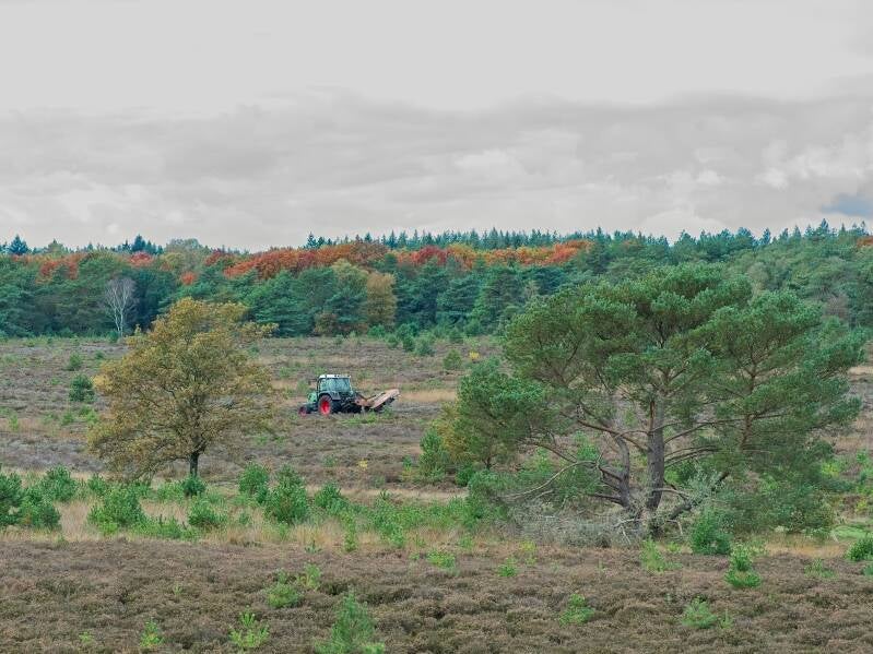 Op de Elspeterheide zijn er op een aantal plekken veel heidestruiken doodgegaan. Een maaimachine maait de dode struiken weg waardoor volgend jaar hopelijk veel nieuwe heideplantjes ontkiemen. Het is een vreemd gezicht, al die rollen in het landschap.