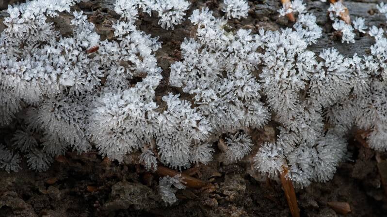 Deze week is het mistig en het is net onder nul. In het oude beukenbos van het Vierhouterbos is overal ijshaar te zien op de afgevallen takken die op de grond liggen. IJshaar is een vreemd fenomeen dat veroorzaakt wordt door de stofwisseling van schimmels in dood hout. Bij dat proces komt water vrij dat bevriest en als fragiele draden te zien is. Ook wel sneeuwbaard genoemd.
