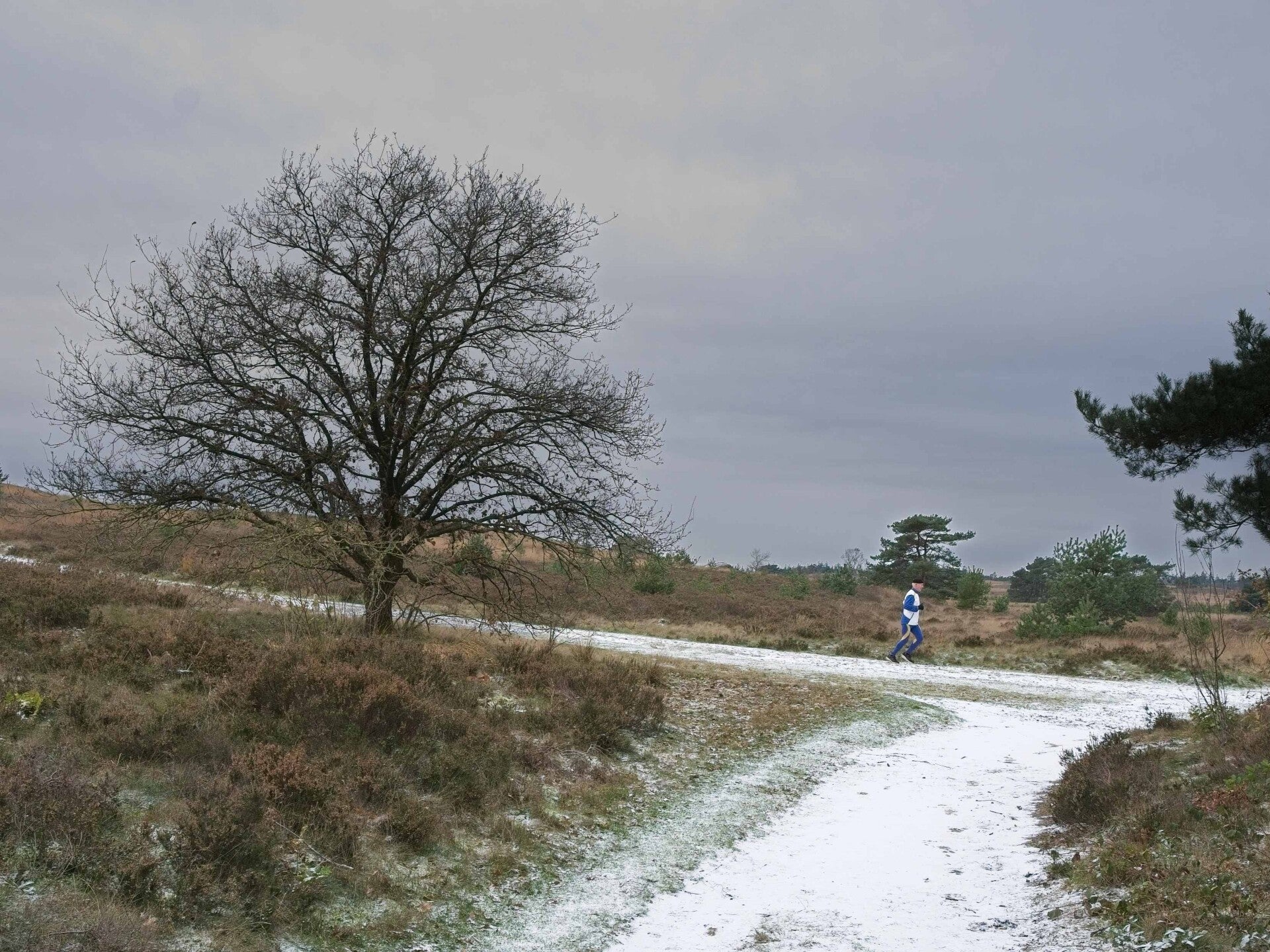 Later in de week is er een beetje stuifsneeuw gevallen. Dat blijft het liggen op het bevroren zandpad.